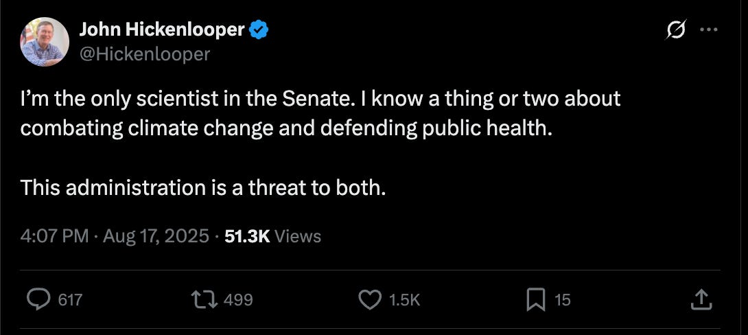 His phrasing reveals more than strategy—it reveals narcissism. By stressing that he is “the only scientist,” Hickenlooper casts himself as uniquely enlightened, uniquely qualified, uniquely indispensable.